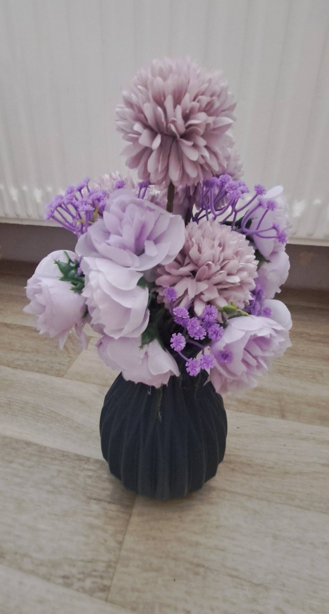Fialkové aranžmá cena: 390 Kč skl. číslo: AR00076 Fialkové aranžmá, šedá plastová váza. Výška aranžmá 33 cm.