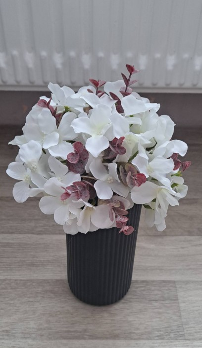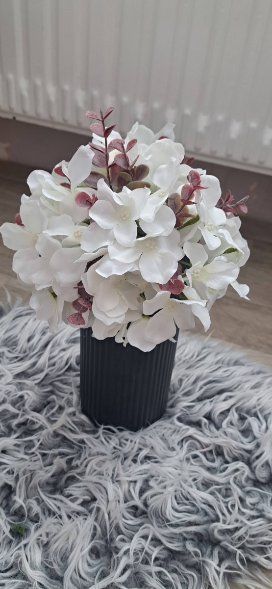 Hortenzie bílá cena: 350 Kč skl. číslo: AR0025 Hortenzie bílá, černá plastová váza, výška aranžmá 29 cm.