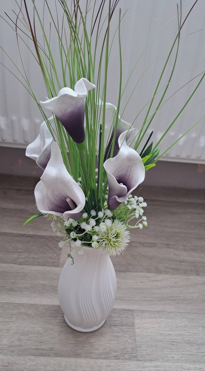 Kaly bílo-fialové cena: 350 Kč skl. číslo: AR0012 Kaly bílo-fialové. Bílá plastová váza, výška aranžmá 45 cm.