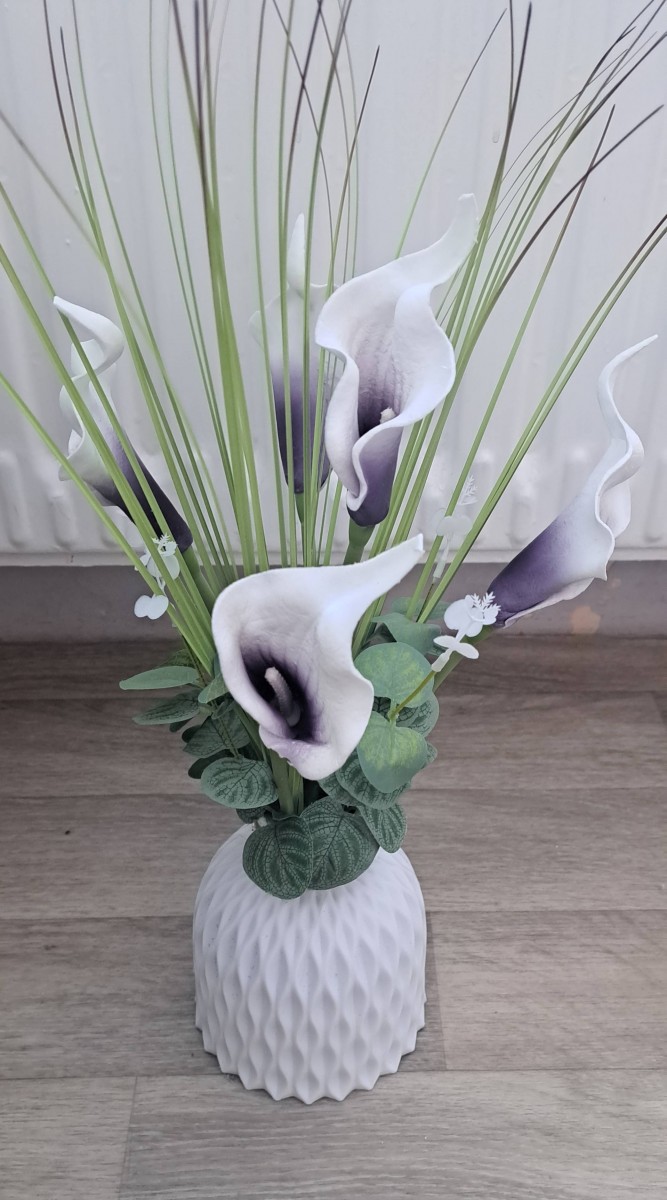 Kaly fialové, bílá plastová váza, výška aranžmá 43 cm.