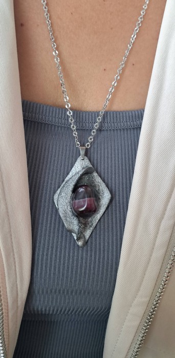 Přívěsek z fimo hmoty, s achátem růžovým. Velikost přívěsku 5,5 x 3,5 cm, řetízek 61 cm - ocel.