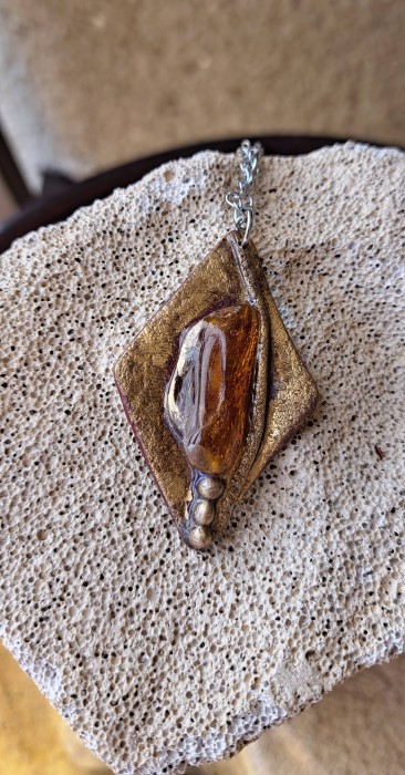 Přívěsek z FIMO hmoty s jantarem. Velikost 3,5 x 5,5 cm, řetízek 57 cm, ocel.