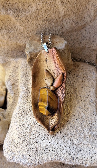 Přívěsek z FIMO hmoty, minerál tygří oko. Přívěsek 7 x 3 cm, řetízek 55 cm, ocel.