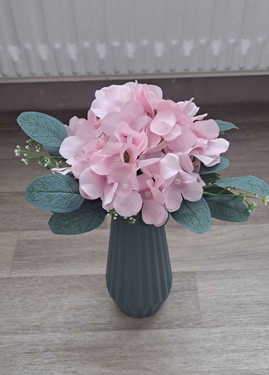 Růžová hortenzie Cena: 290 Kč skl. číslo: AR0087 Růžová hortenzie, výška aranžmá 32 cm, barva vázy - zelená khaki, plastová.