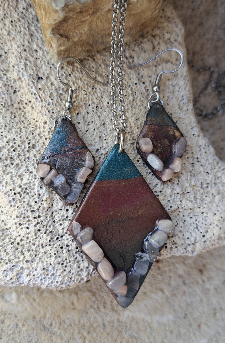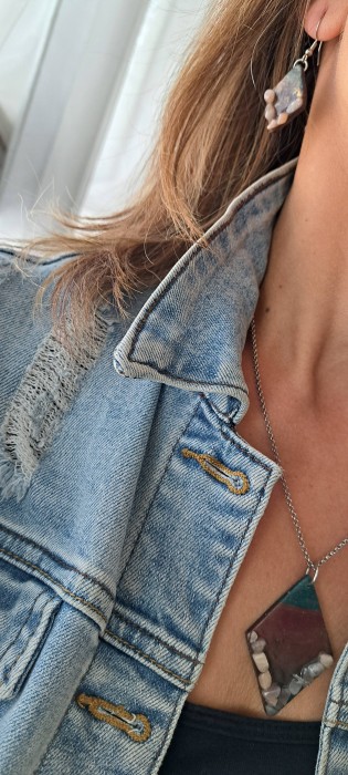 Souprava z FIMO hmoty, s minerálem měsíční kámen. Náušnice 2,8 x 1,7 cm, afroháček ocel. Přívěsek 5 x 3,4 cm, řetízek 42 cm + 6 cm prodlužující řetízek.