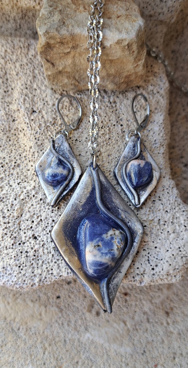 Souprava Sodalit, náušnice 2,8 x 1,8 cm ocel. Přívěsek 5,2 x 3,3 cm, řetízek 50 cm, ocel.