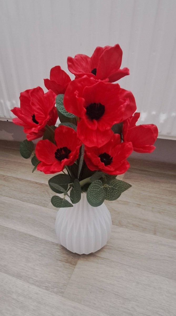 Vlčí máky, bílá plastová váza, výška aranžmá 33 cm.